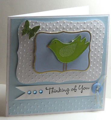This week's challenge over at Our Creative Corner is to use the colours blue and green. I created a couple of cards for this one. I'm in such a "waiting-for-spring" mode that I wanted bright, cheerful cards for some friends.This card uses DCWV paper, a Stampabilities stamp, and Ms Martha's loopies border punch.